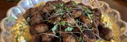 Brown Sugar & Jalapeno Glazed Bacon Meatballs with Corn Bleu Cheese Relish